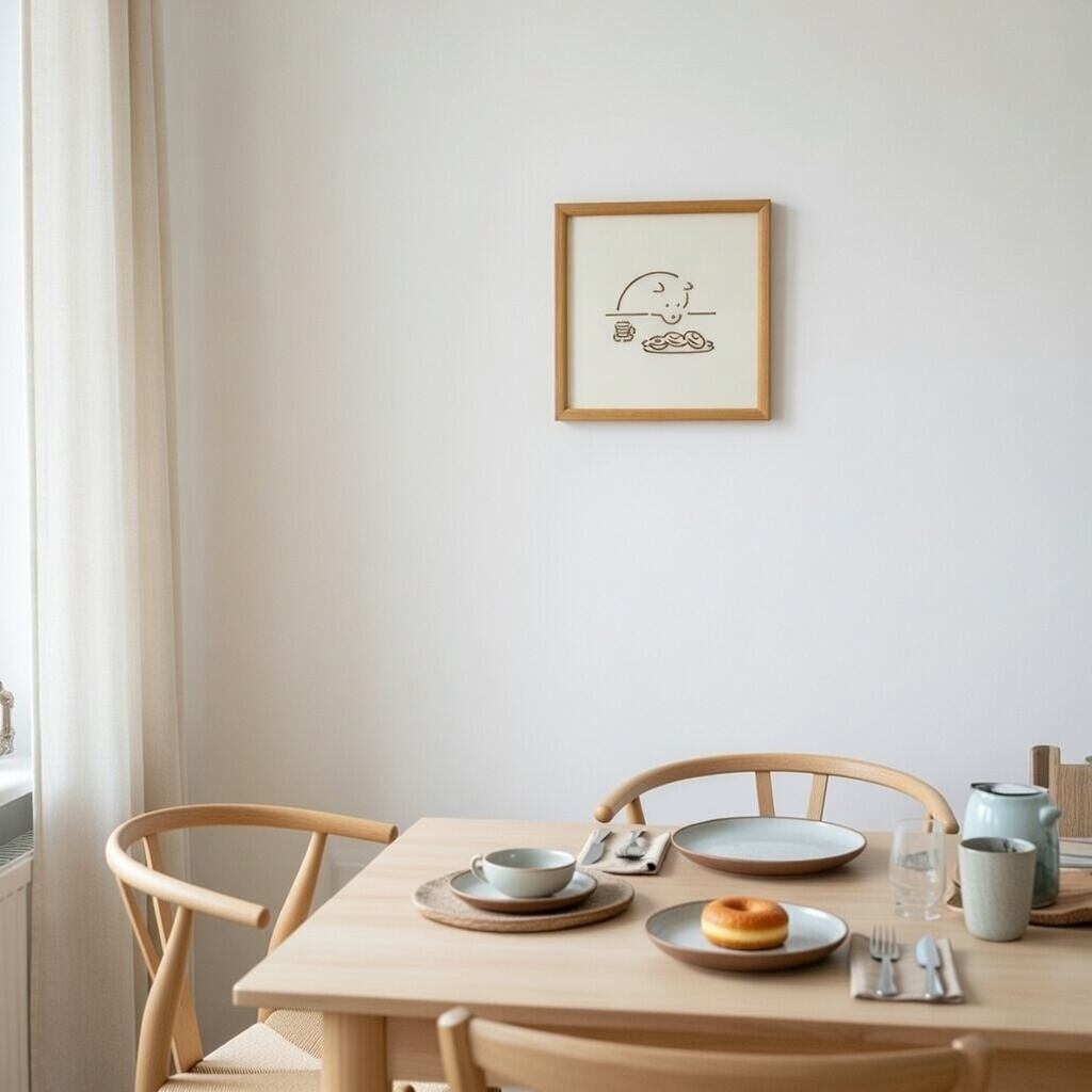 線画のイラストを、木で表現したインテリアです。イラストを印刷するのではなく、約2mmの木材をカットし、線そのものを浮かび上がらせています。