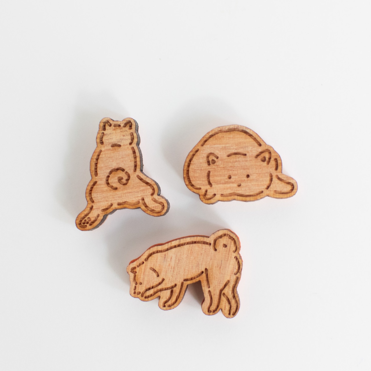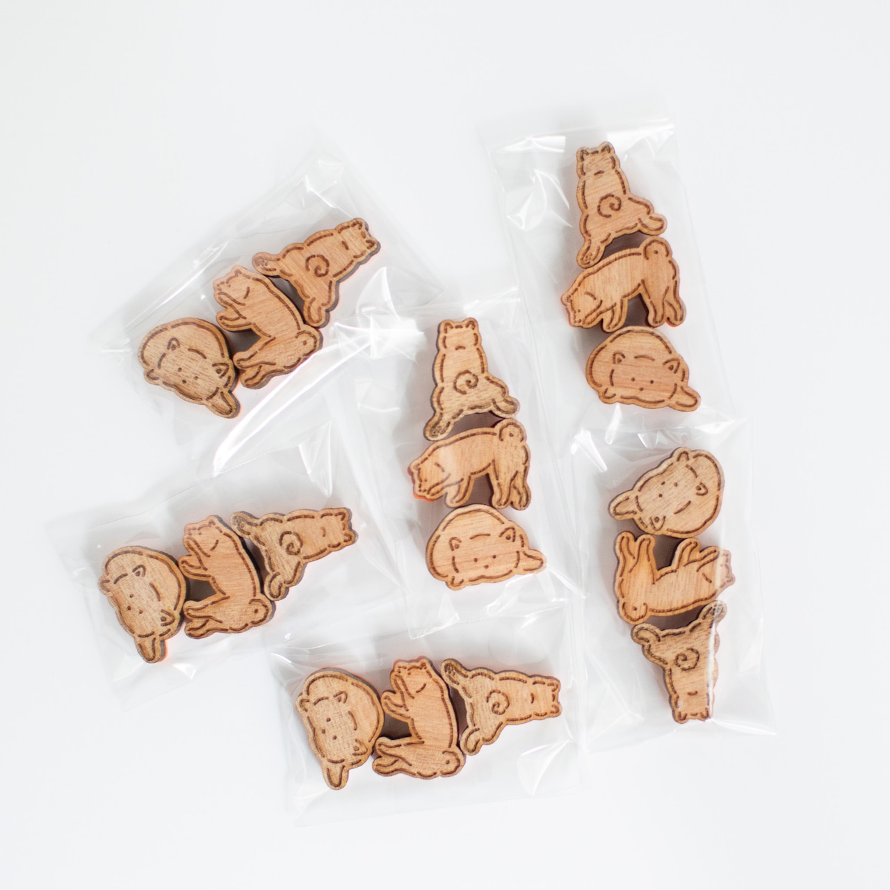 デザインはそれぞれ、ドーナツ、フランスパン、コーヒーを見つめる柴犬たち。