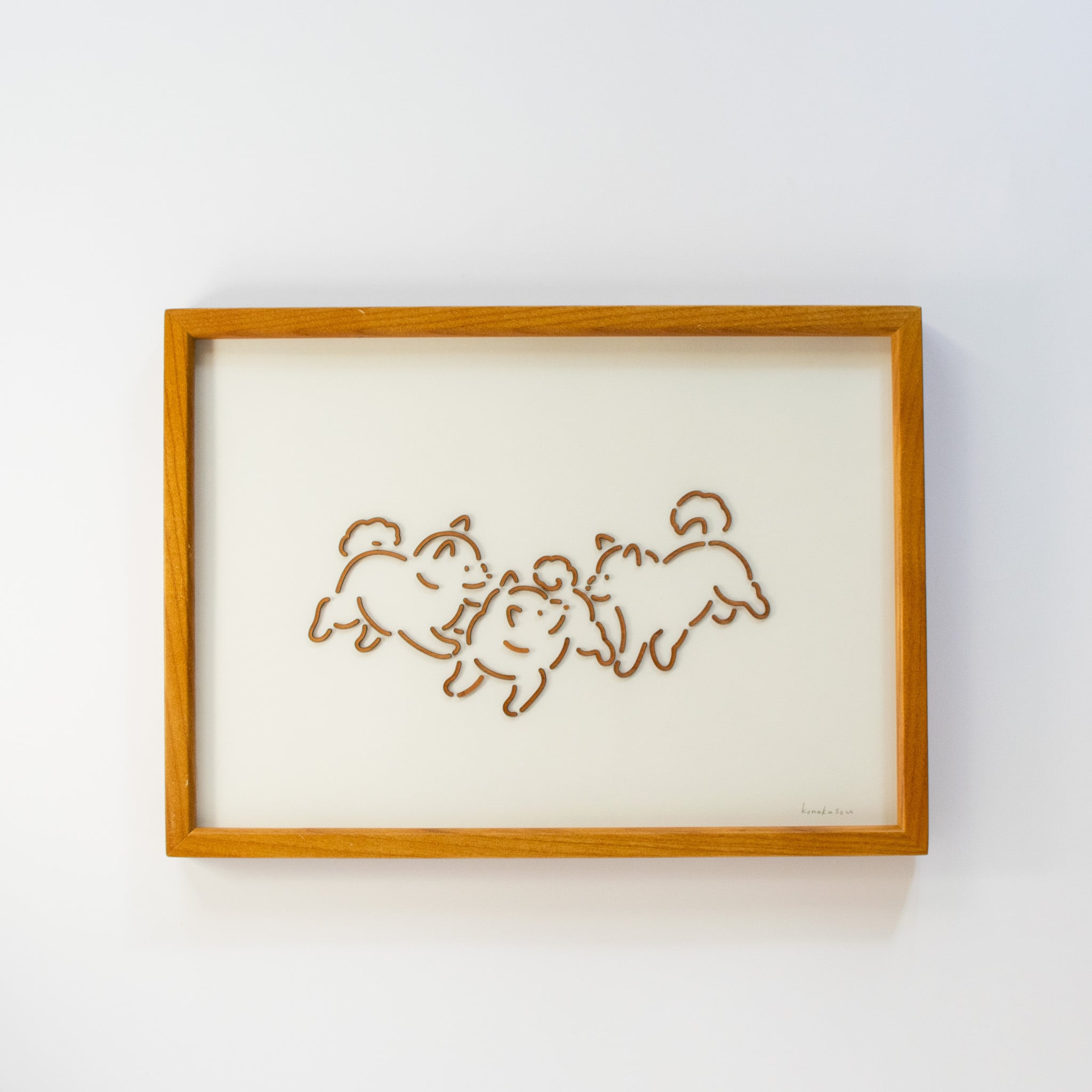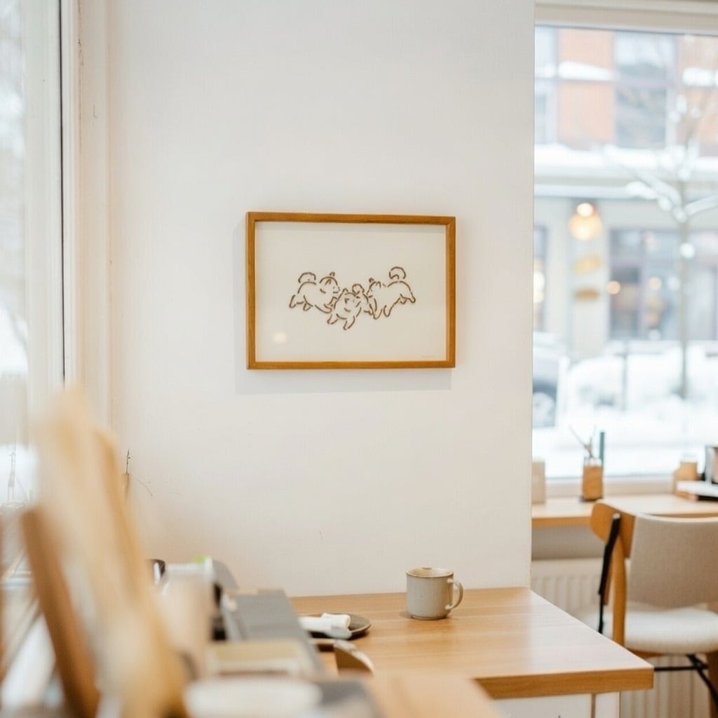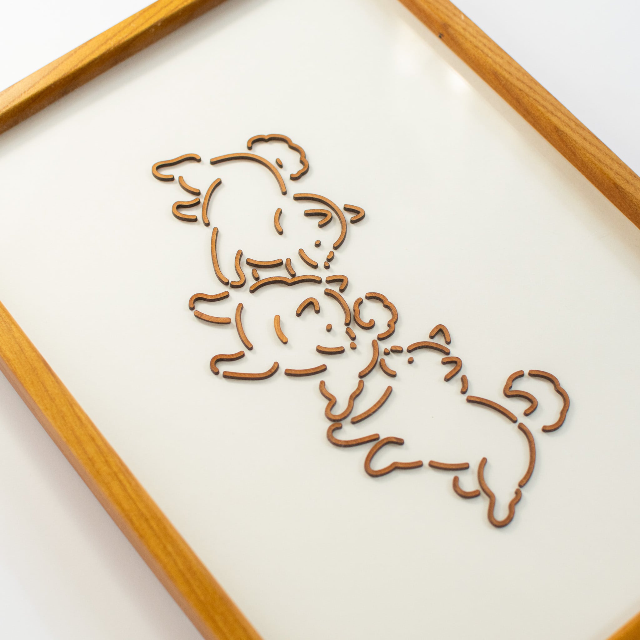 線画のイラストを、木で表現したインテリアです。イラストを印刷するのではなく、約2mmの木材をカットし、線そのものを浮かび上がらせています。