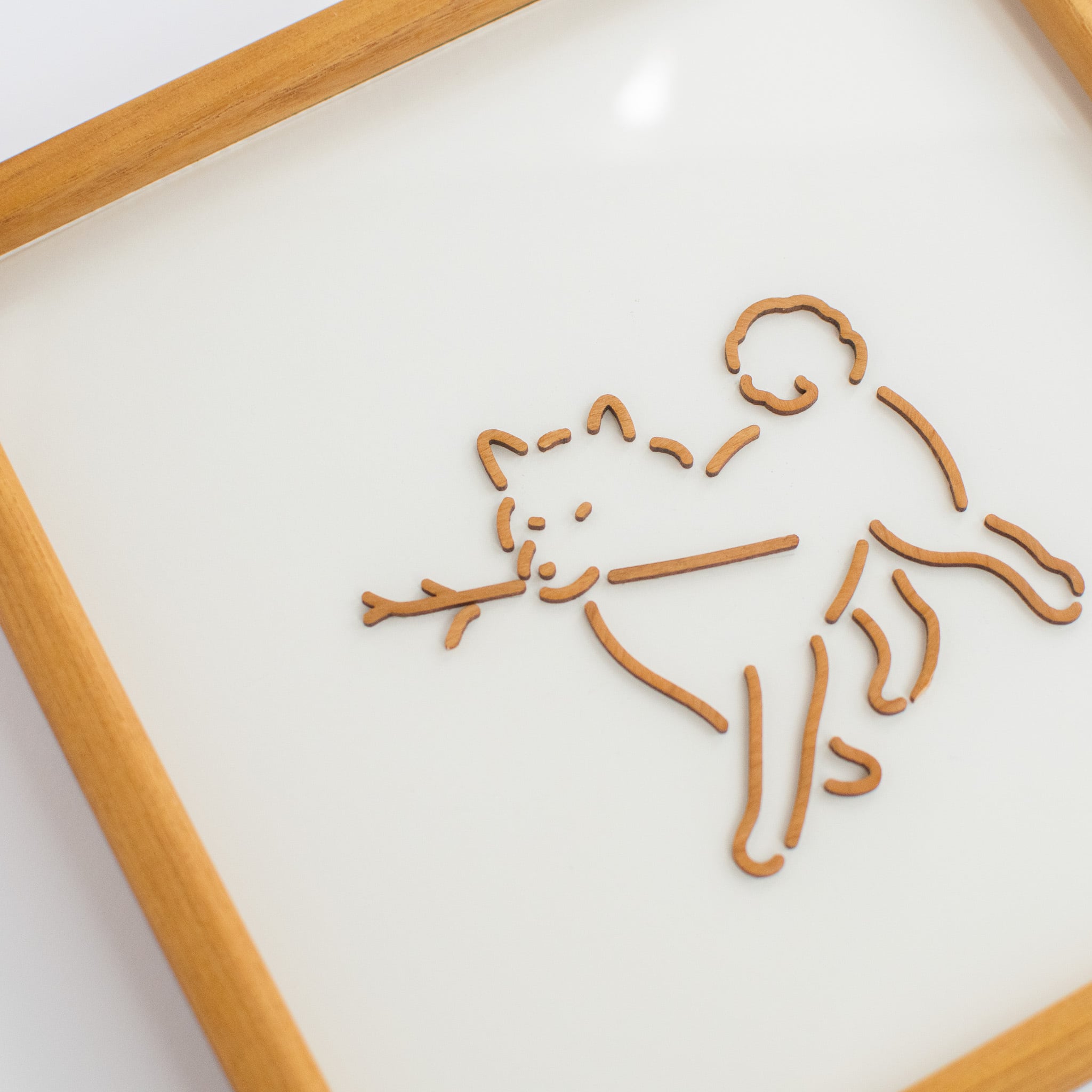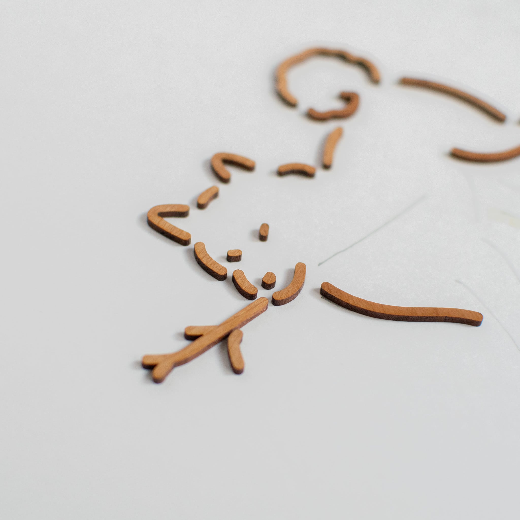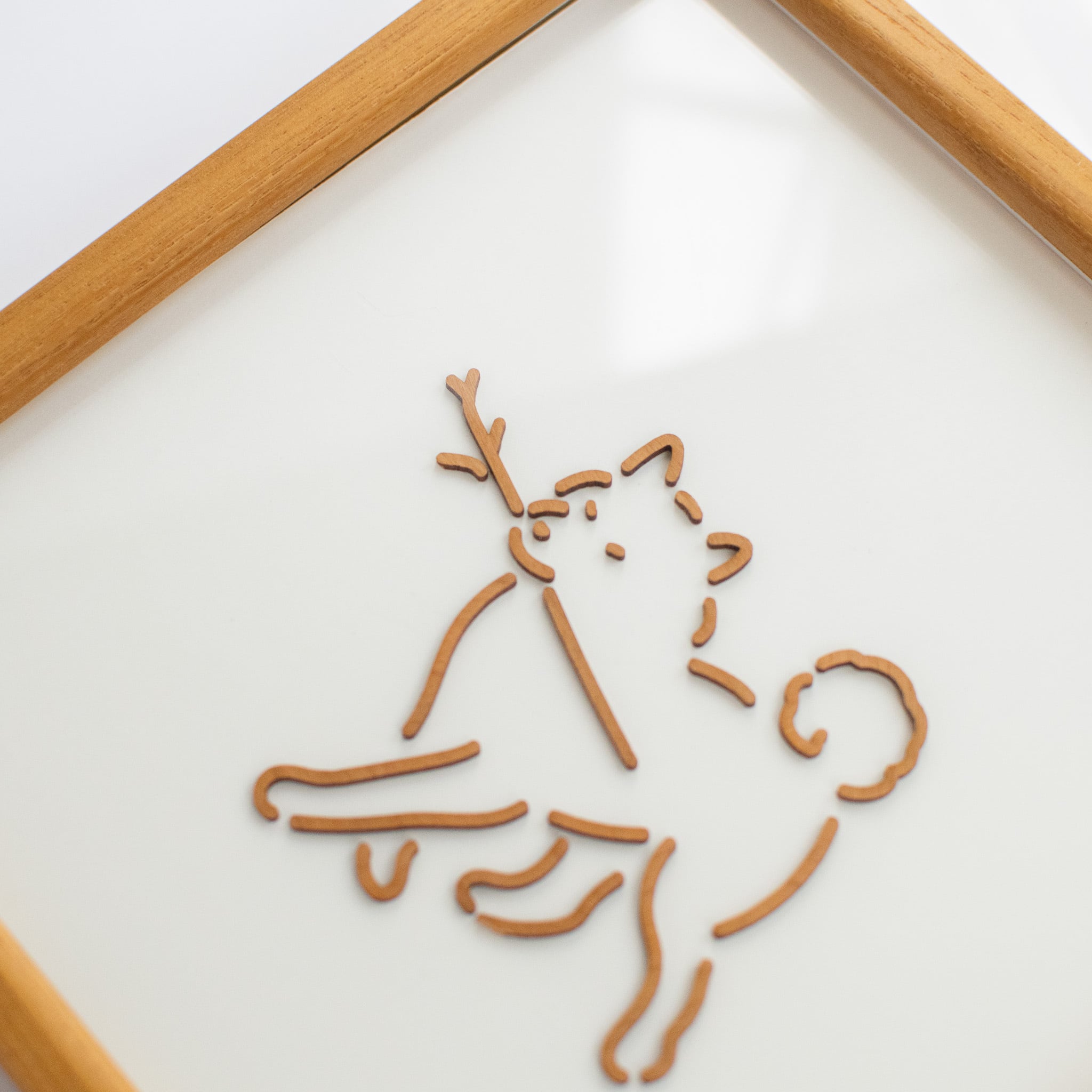 線画のイラストを、木で表現したインテリアです。イラストを印刷するのではなく、約2mmの木材をカットし、線そのものを浮かび上がらせています。