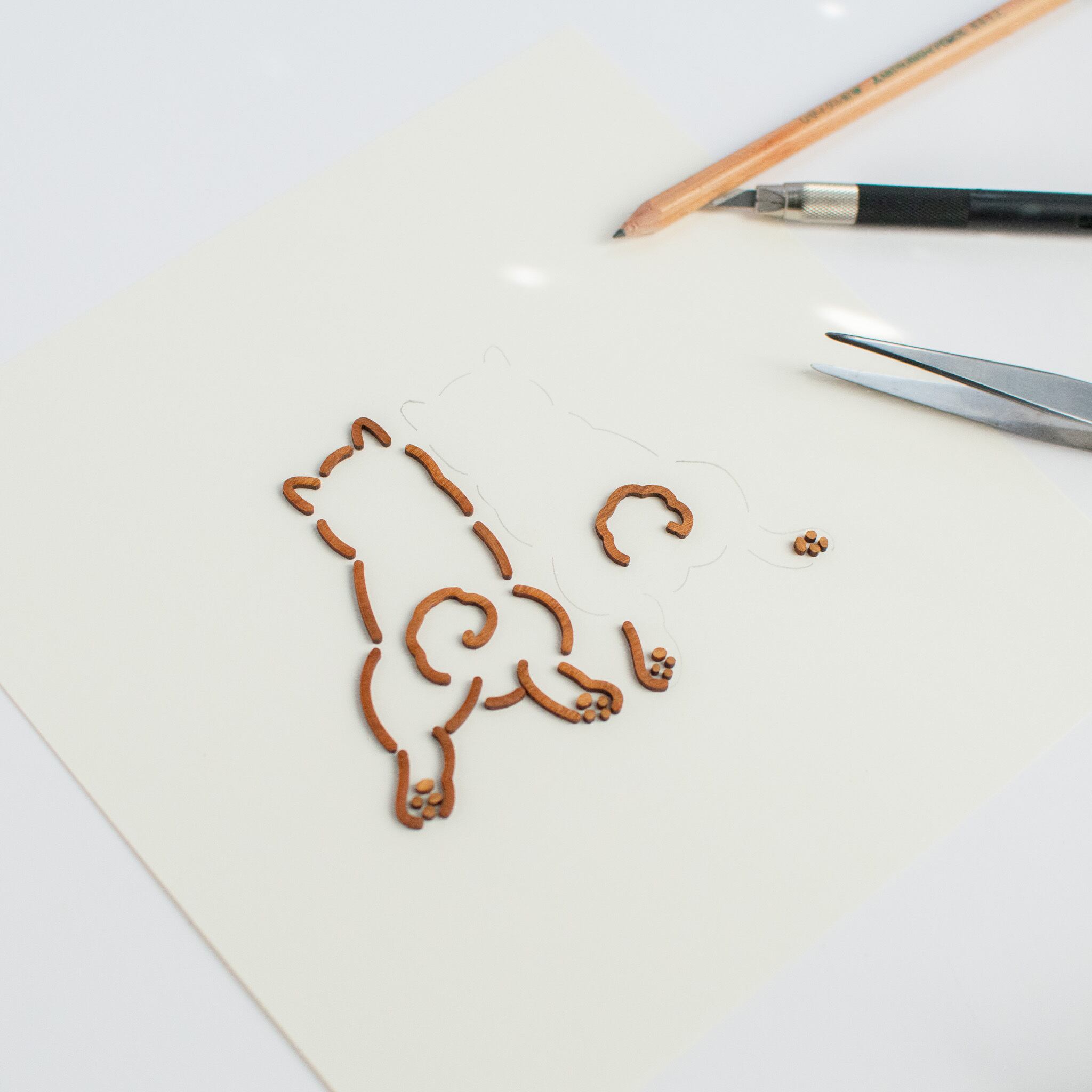 線画のイラストを、木で表現したインテリアです。イラストを印刷するのではなく、約2mmの木材をカットし、線そのものを浮かび上がらせています。