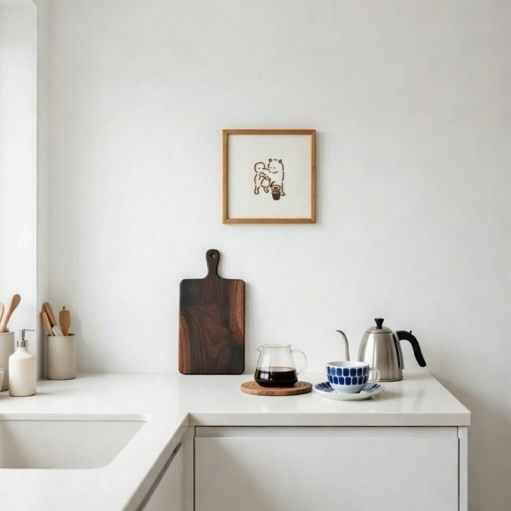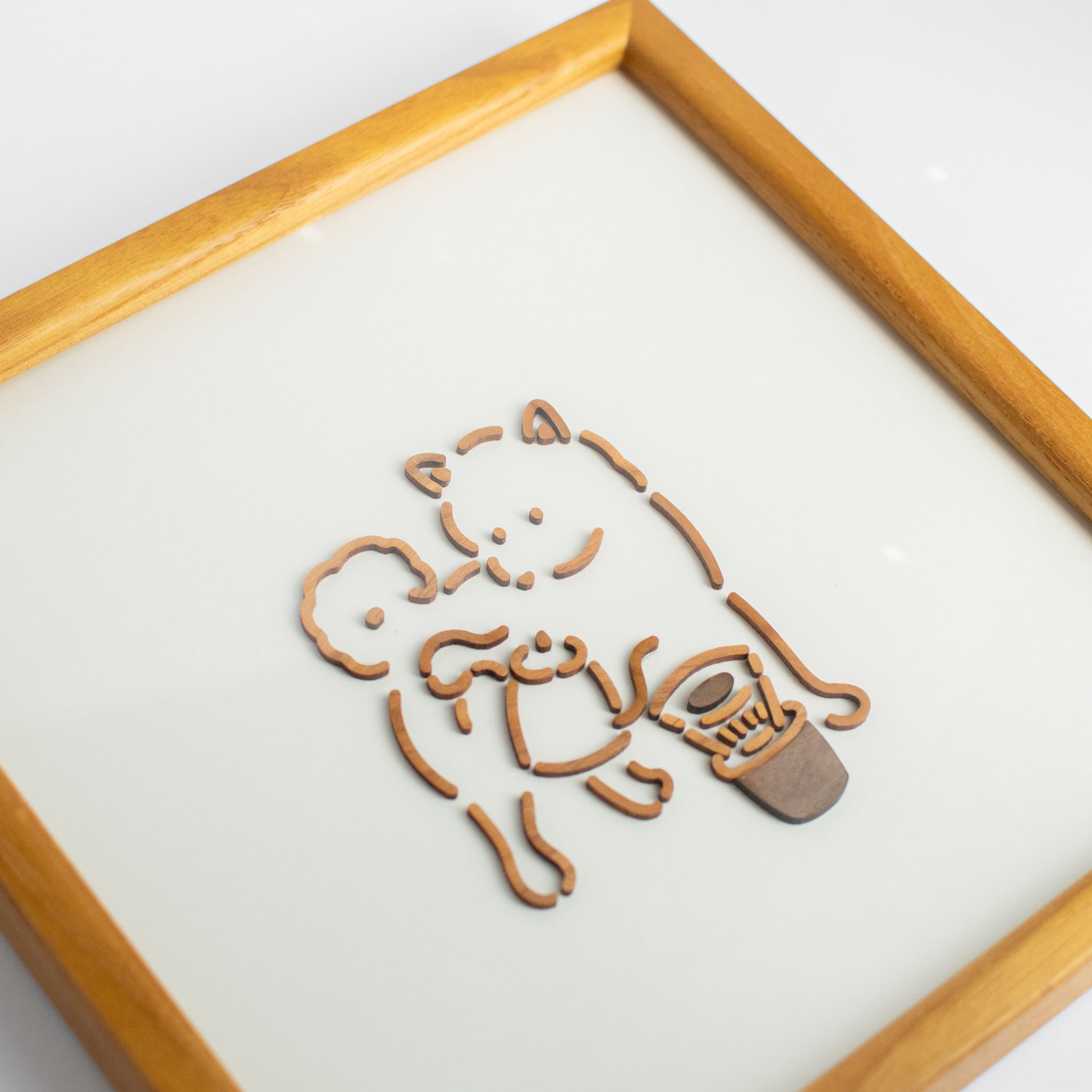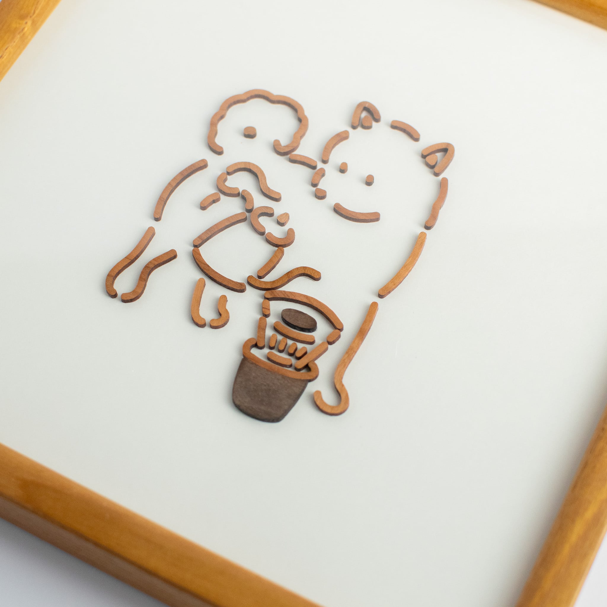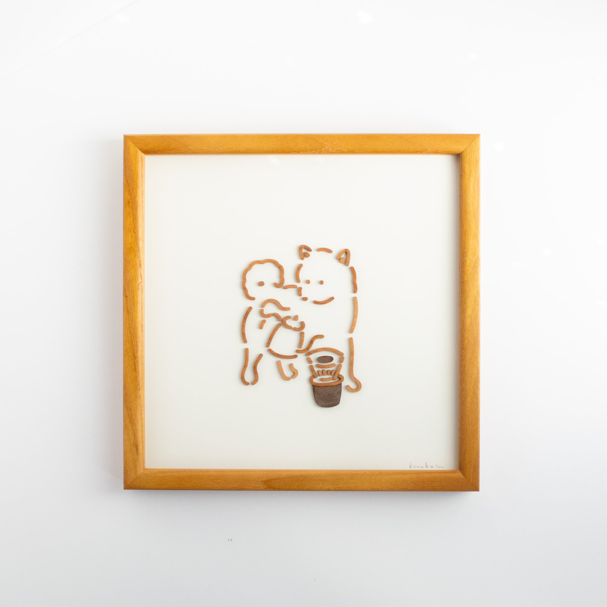 より本格的にコーヒーを淹れるようになった柴犬。豆やドリッパーにもこだわりだした柴犬を、木製のフレームにおさめました。