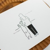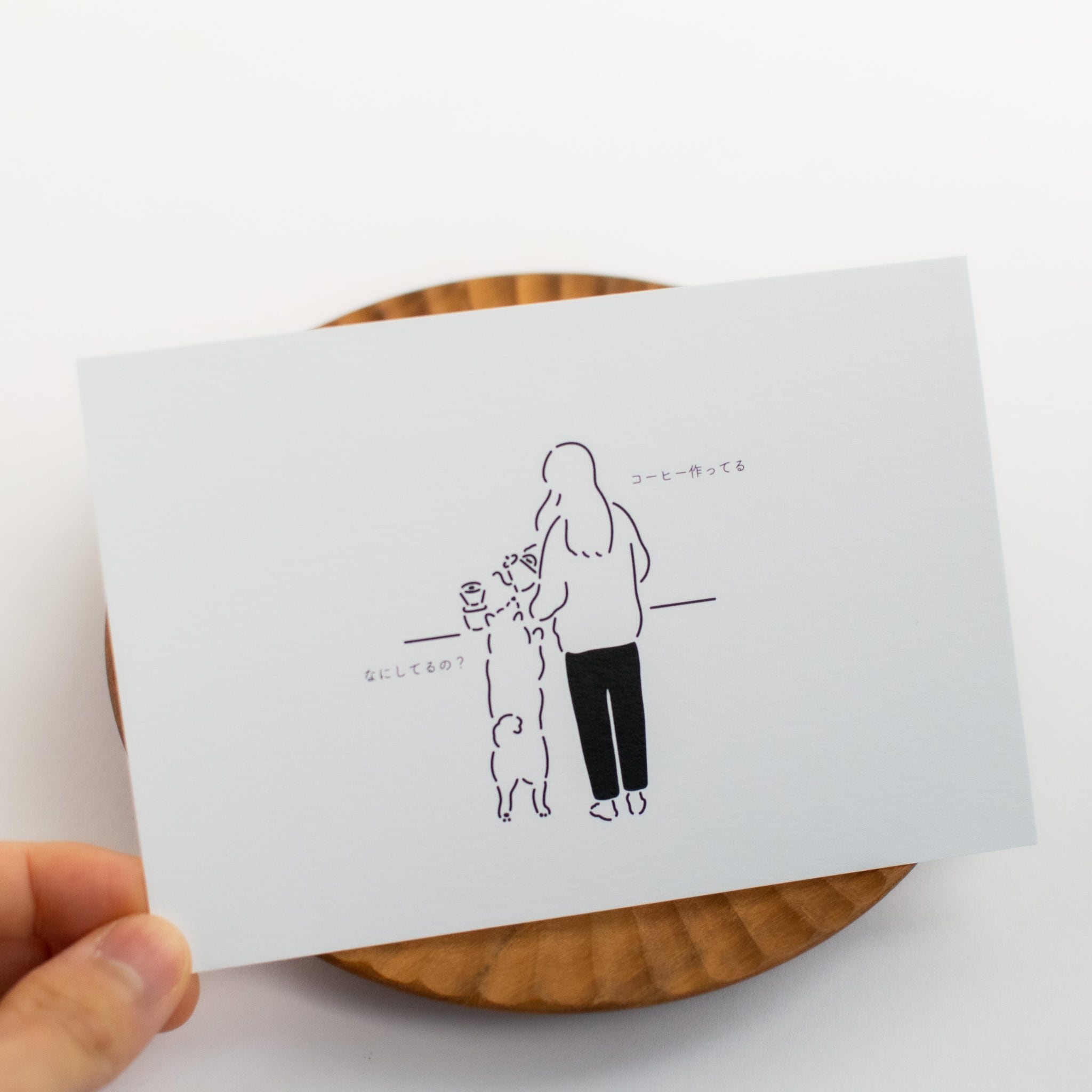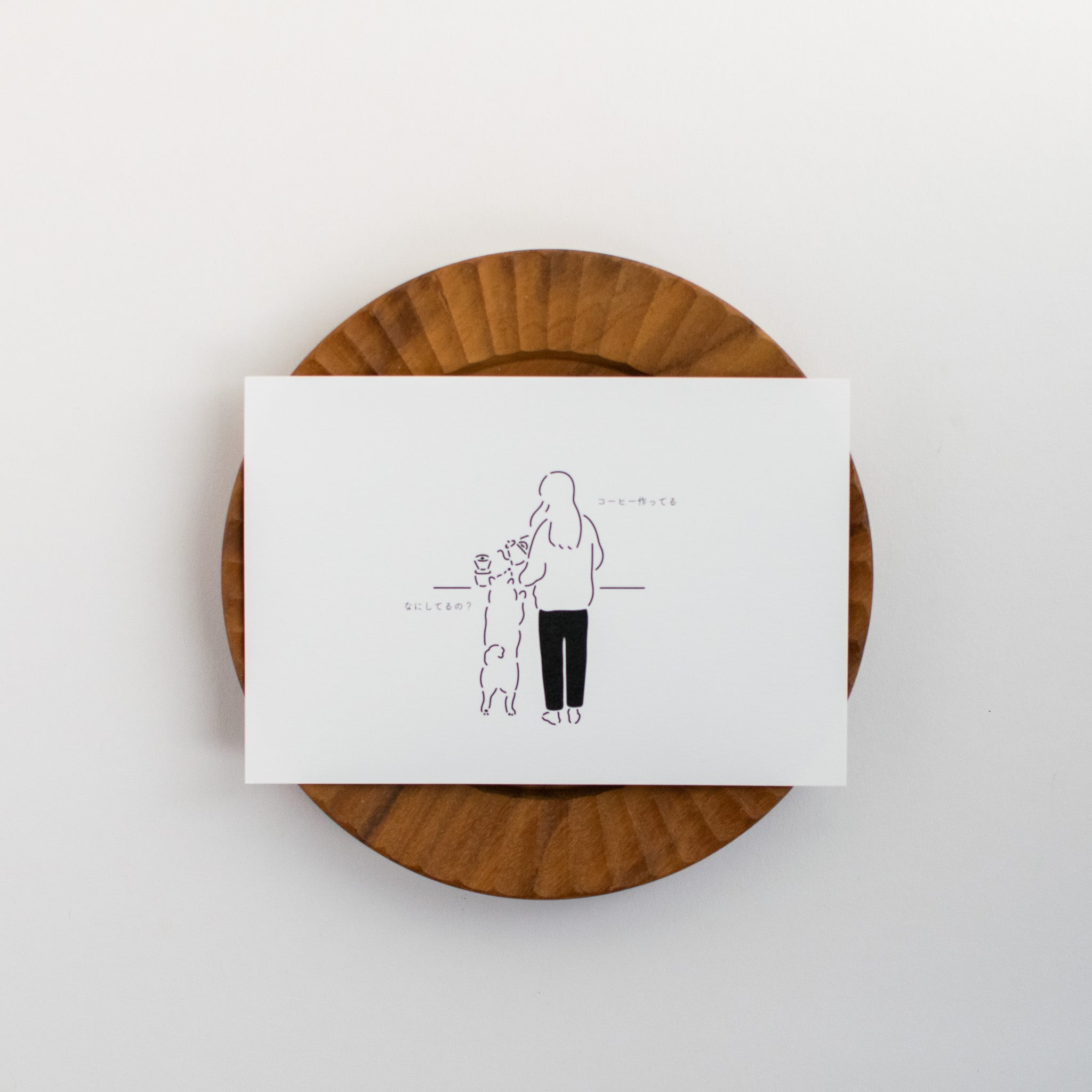 コーヒーを淹れたい飼い主さんと、飼い主さんのことが気になる柴犬のイラストです。