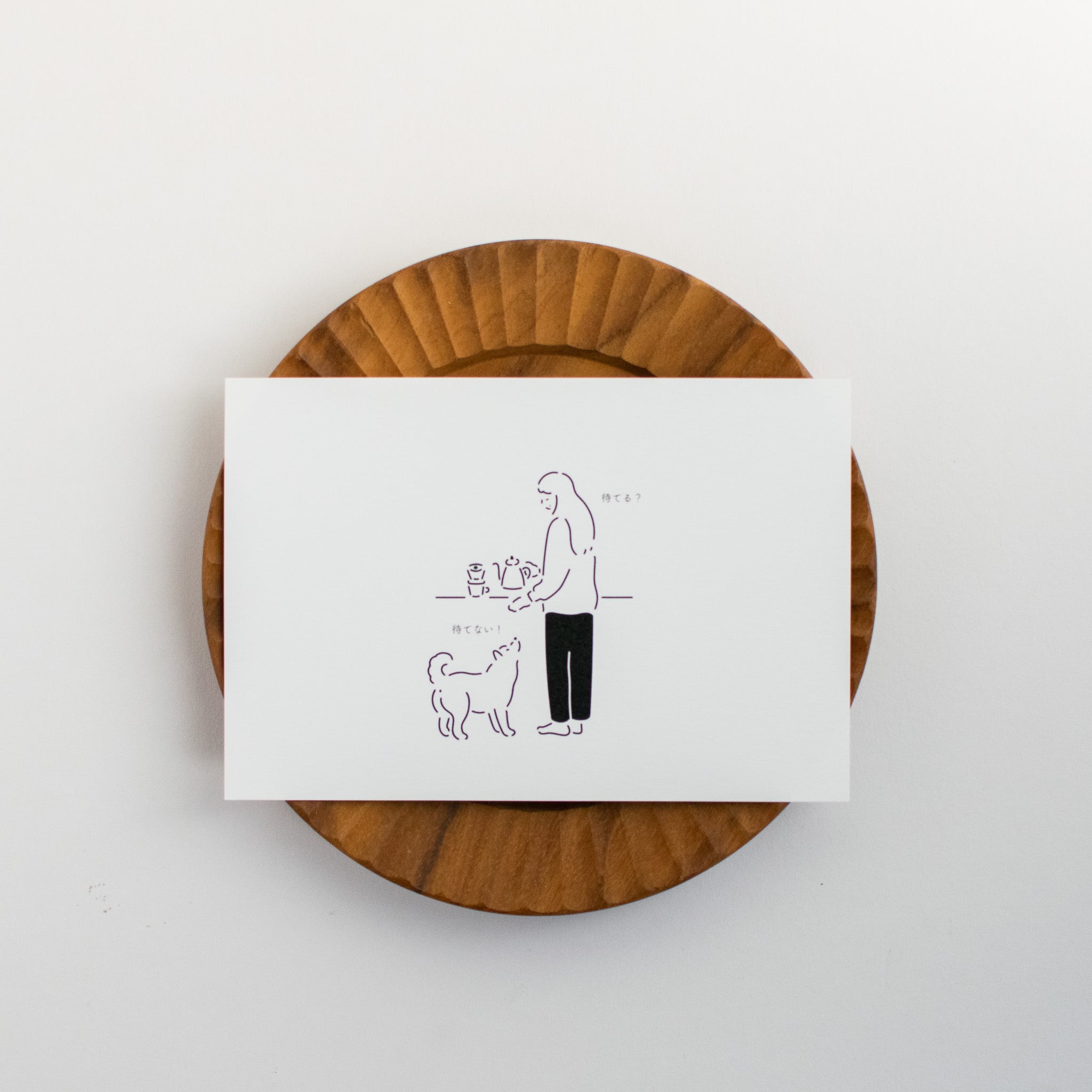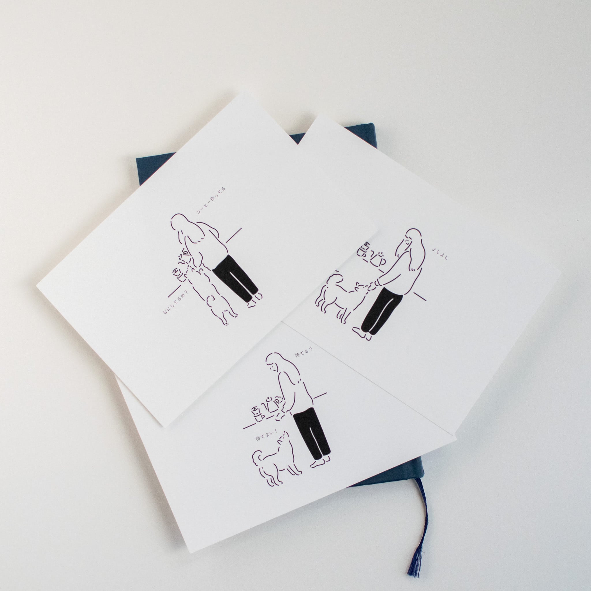 コーヒーを淹れたい飼い主さんと、飼い主さんのことが気になる柴犬のイラスト。