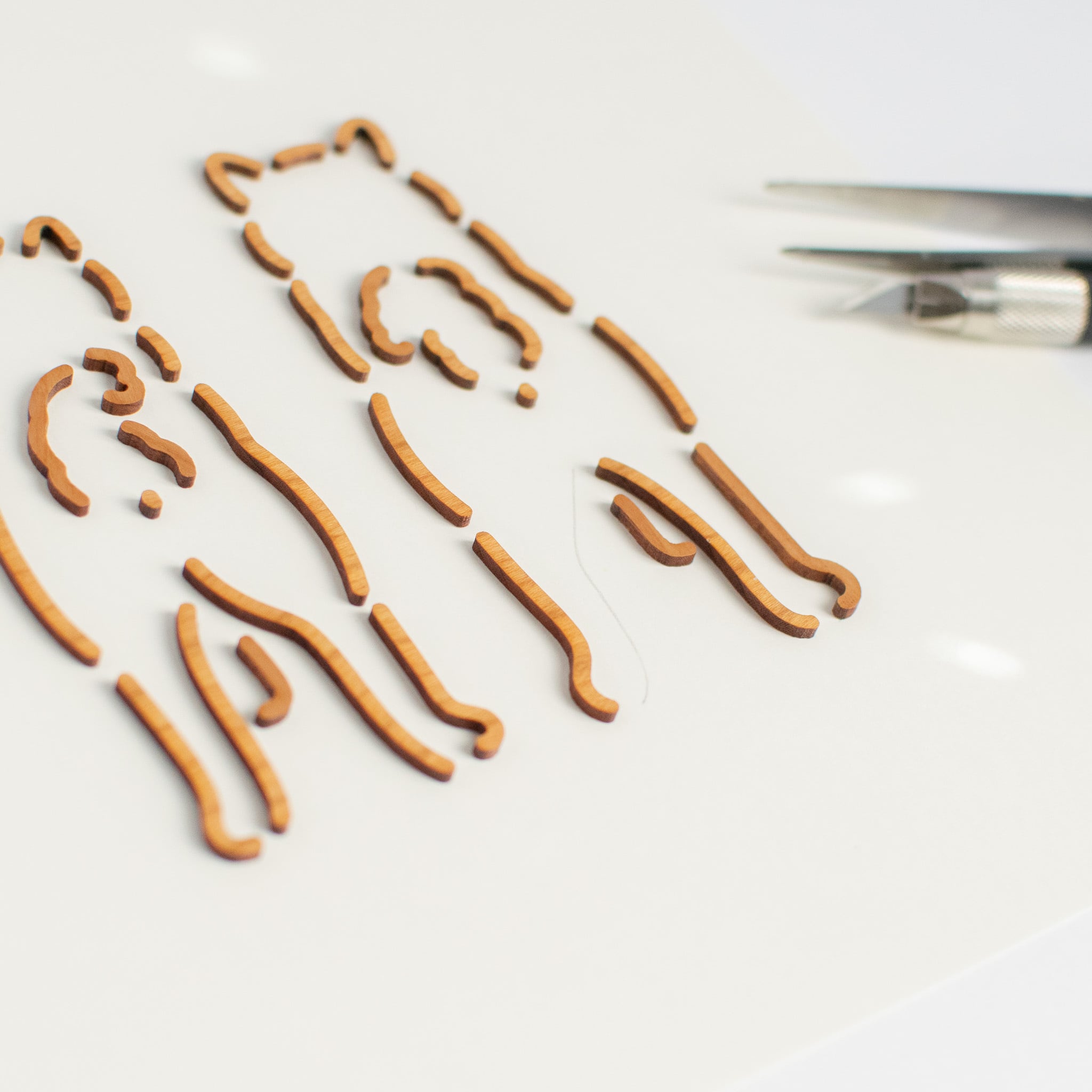 線画のイラストを、木で表現した作品です。約2mmの木材をカットし、線そのものを浮かび上がらせています。