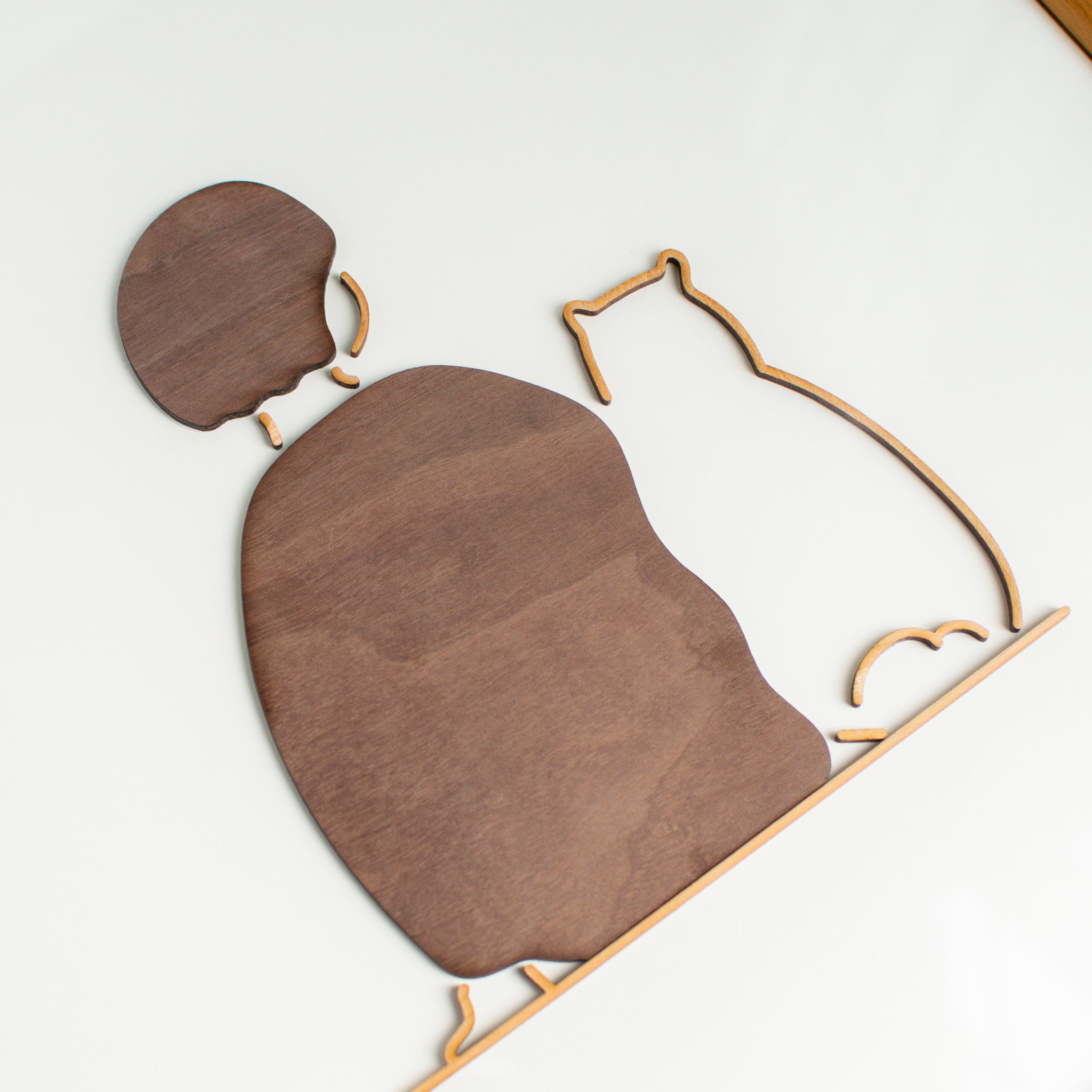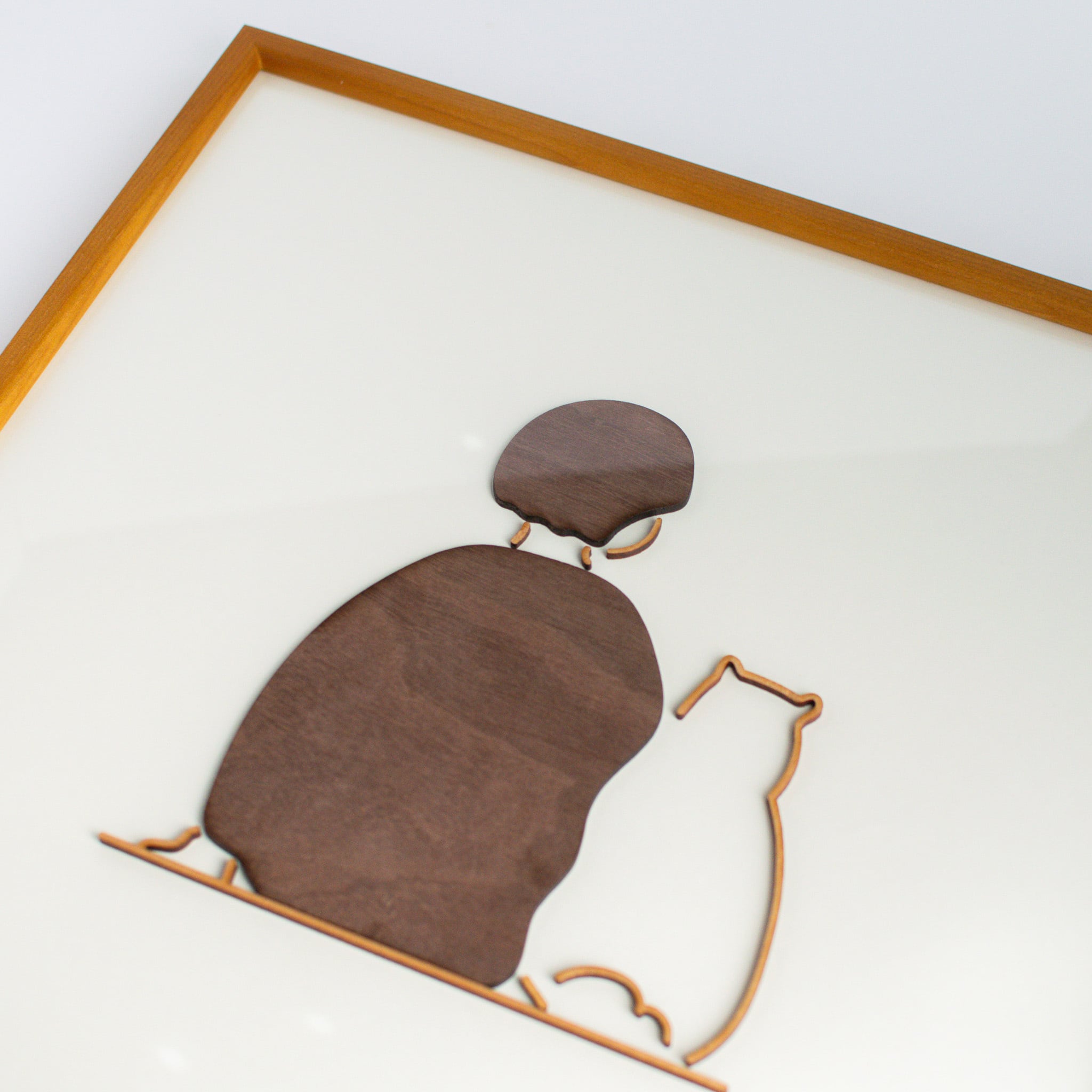 線画のイラストを、木で表現した作品です。約2mmの木材をカットし、線そのものを浮かび上がらせています。