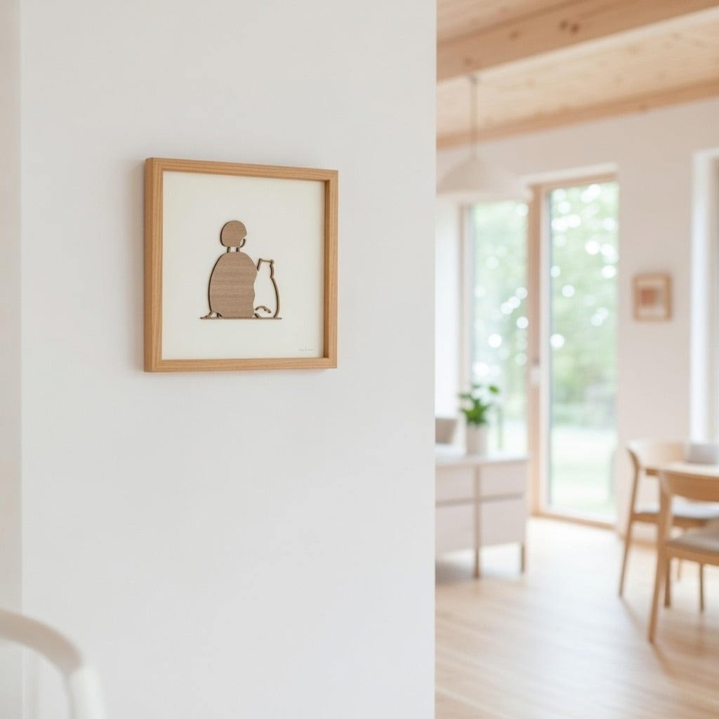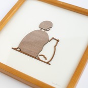 飼い主さんと柴犬が寄り添い合っている静かなシーンをを木製フレームにおさめました。